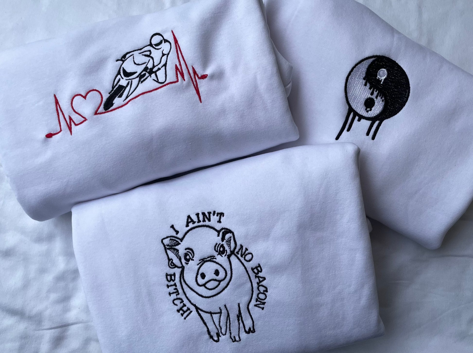 Kreiere ein einzigartiges Sweatshirt / Hoodie! Wähle ein Design, Foto oder Motiv deiner Wahl und wir sticken es auf einen Pullover - alles ist nahezu machbar! Lasse deiner Kreativität freien Lauf und gestalte einen Pullover, der nur deiner ist! Wir geben unser Bestes, um dein Motiv zu erstellen. Probiere es jetzt aus! Falls ein Motiv nicht möglich wäre, würden wir dich kontaktieren und dein Geld zurückerstatten.